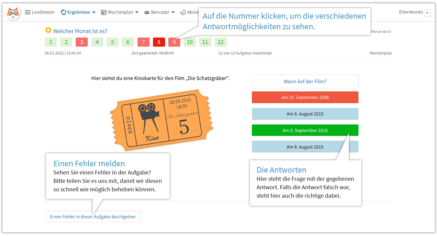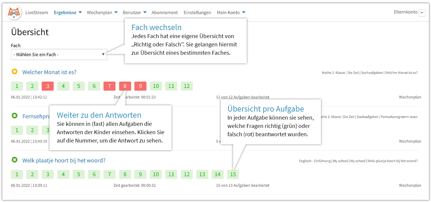 In diesem Bereich können Sie sofort sehen, welche Fragen Ihr Kind richtig und welche es falsch beantwortet hat. Sie können auch die Antworten sehen, die Ihr Kind gegeben hat. Wenn Ihr Kind einen Fehler gemacht hat, können Sie auch sehen, welche Antwort die richtige gewesen wäre.