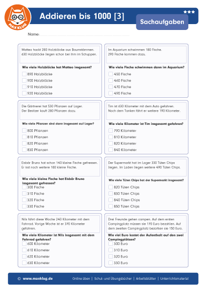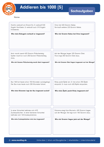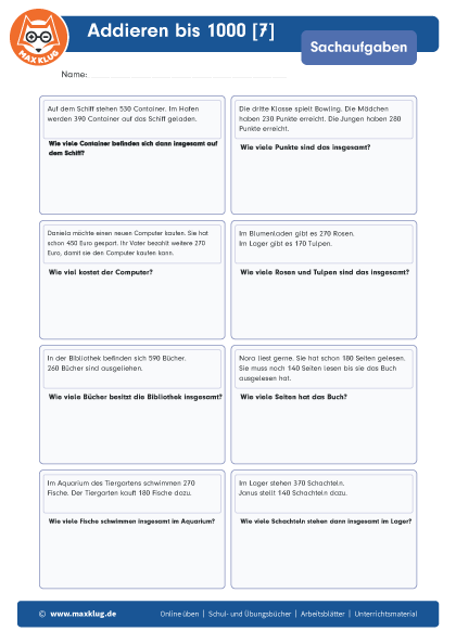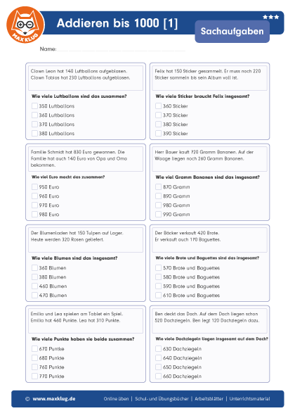 Arbeitsblätter > Sachaufgaben > Addieren > Bis 1 000